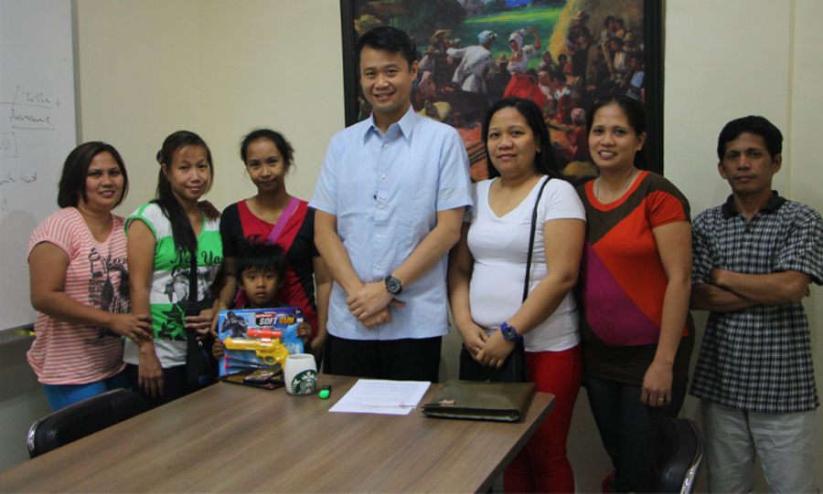 Rochelle Calixto (leftmost) with Valenuela City Congressman Win Gatchalian and other OFW beneficiaries in Win Tayo Lingkod OFW Program. Photo by Camille Nepomuceno